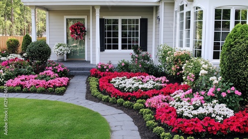 A front yard with neatly arranged flower beds, creating a welcoming and visually pleasing environment.