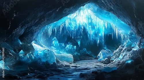 A frozen cave interior with blue ice formations and icicles hanging from the cave ceiling and walls