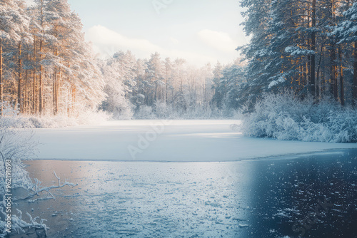 A Frozen Lake Beckons, Surrounded by Snow-Dusted Trees, the Sun Casting a Golden Glow on the Frosted Landscape.