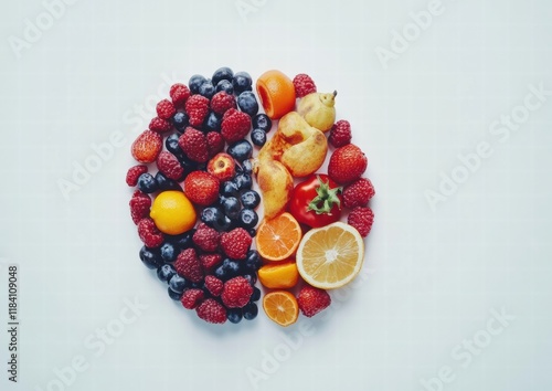 A fruit salad is cut in half, with one half containing blueberries, raspberries