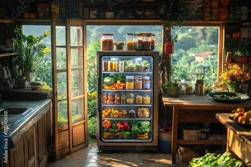 A full refrigerator with fresh produce and pantry staples in a rustic kitchen with a view of a lush green landscape outside.