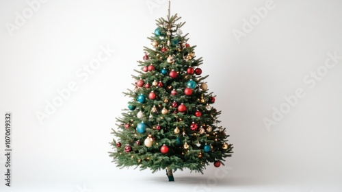 A fully decorated Christmas tree with red and gold ornaments, lights, and a star topper, set against a simple, neutral background.