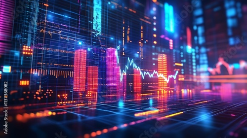 A futuristic abstract business graph featuring stacked multicolored cubes, glowing financial icons like stock arrows and currency symbols hovering nearby,