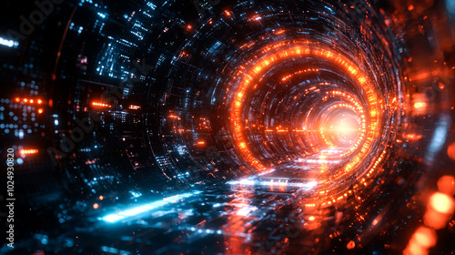 A futuristic, abstract tunnel with bright red and blue neon lights.