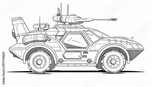 A futuristic armored vehicle equipped with a turret and various gadgets. Ideal for rugged terrains or sci-fi games and animations.