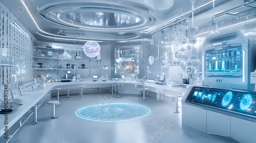 A futuristic biology lab with digital platforms for studying microbial genetics and evolution