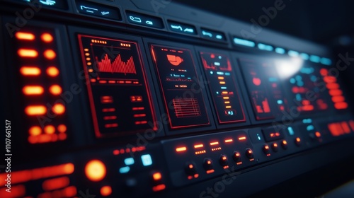 A futuristic control panel with vibrant red and blue lights displays various data metrics and visualizations in a sleek design.