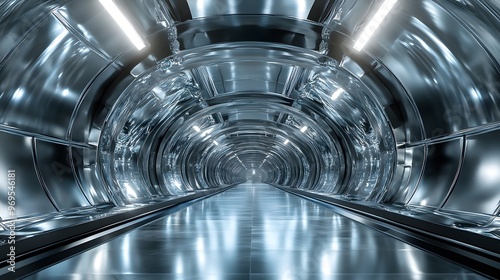 A futuristic crystal tunnel with silver metal accents, architectural photography