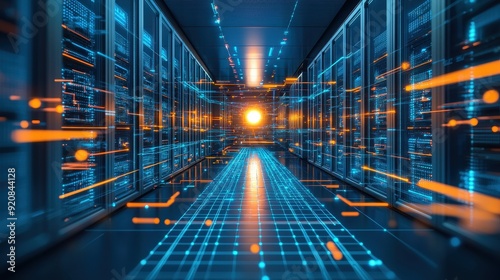 A futuristic data center with glowing servers and digital connections, representing advanced technology and innovation.