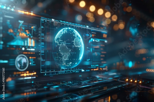 A futuristic digital globe with holographic interfaces displays global data insights in a high-tech environment