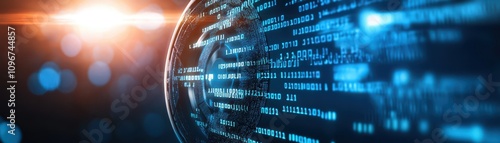 A futuristic digital landscape featuring binary code and a glowing orb, symbolizing technology and data flow.