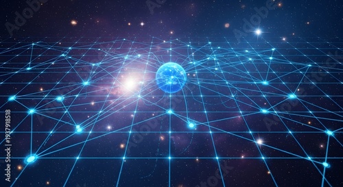 A futuristic digital network illustration with a blue planet and stars in space