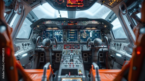 A futuristic helicopter interior with advanced control panels, augmented reality displays, and ergonomic seating, highlighted by bright white lighting.
