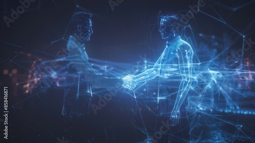 A futuristic hologram handshake between two business professionals, with a sleek, digital background offering ample space for text or branding ,