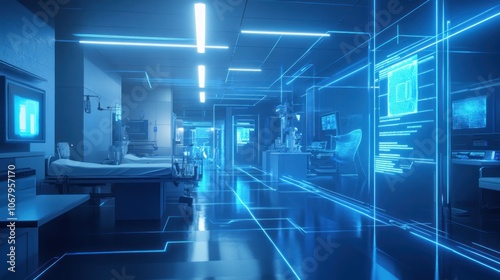 A futuristic hospital corridor with glowing blue lines and digital screens, representing innovation and technology in healthcare.