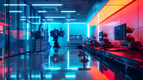 A futuristic lab with advanced technology and bright neon lighting.