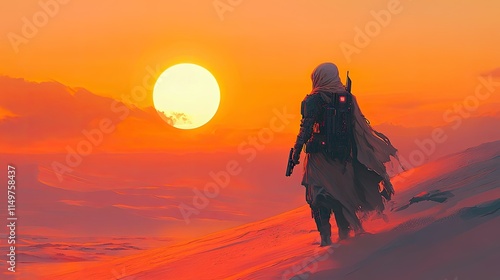 A futuristic nomad clad in advanced tech gear standing on a glowing dune, against a vibrant sunset in an expansive desert.