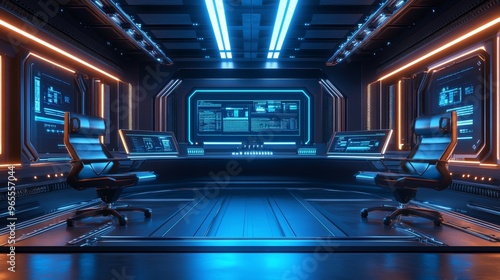 A futuristic podcast studio with sleek metallic chairs, glowing blue LED microphones, and an advanced control panel, set against a dark, high-tech backdrop. Perfect for tech-focused content, with plen