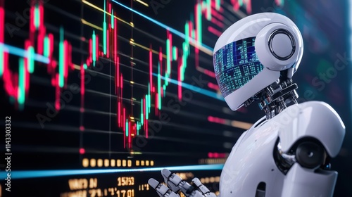 A futuristic robot analyzes stock market data displayed on a digital screen, highlighting the intersection of technology and finance.