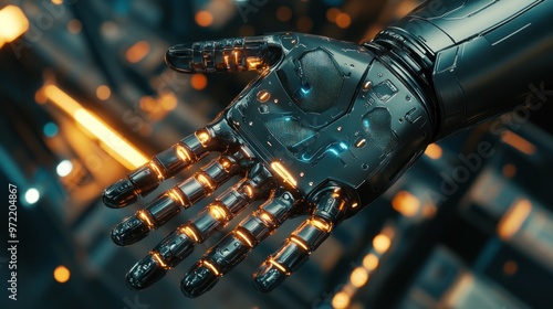 A futuristic robotic hand with glowing elements, showcasing advanced technology and design.