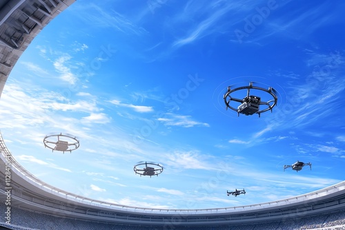 A futuristic scene featuring drones flying in a clear blue sky above a stadium-like structure.