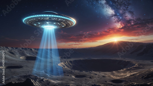 A futuristic scene of a ufo shining a bright beam on a cratered moon at sunset.