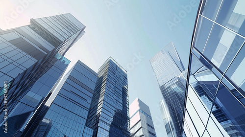 A futuristic skyscraper with a sleek, reflective glass facade rising against a clear blue sky, showcasing modern urban architecture and advanced design
