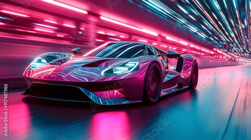 A futuristic sports car races down the neon highway of a nighttime city