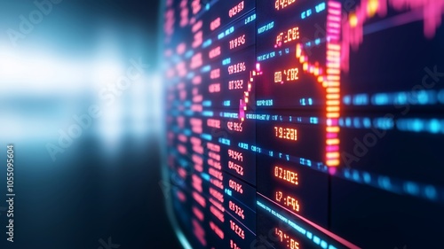 A futuristic stock market screen with virtual reality overlays, showing final stock performance for the year, techinspired, glowing numbers