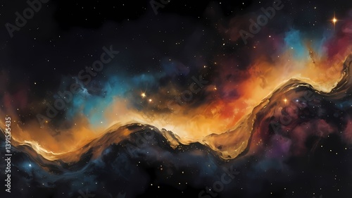 A galactic-inspired gradient painting, where shimmering metallic acrylics create a celestial dance of colors ranging from deep black to fiery gold