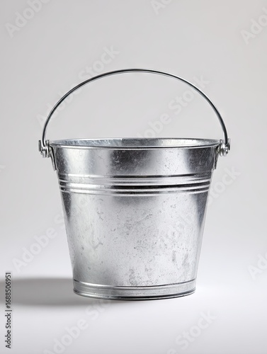 A galvanized metal bucket with a wire handle, showing slight wear and texture, sits on a light gray background