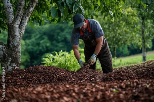 A gardener spreading mulch around the base of newly planted trees, helping retain moisture and improve soil health