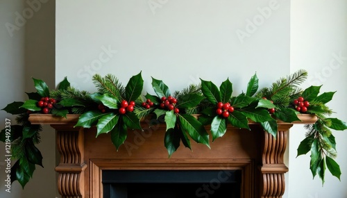 A garland of holly and mistletoe draped over a wooden mantel, garland, holiday