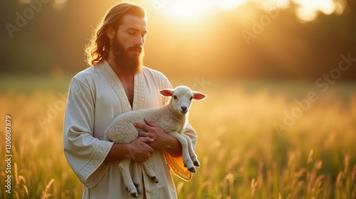 A gentle shepherd in traditional robes holding a white Easter lamb in his arms