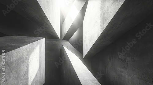 A geometric space with sharp angles and dramatic light, showcasing a modern design aesthetic in muted gray tones.
