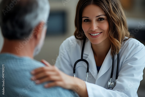 A geriatric doctor consulting and caring for an elderly patient suffering from Parkinson's disease, arthritis, gout, or mental health issues, providing examination and comfort in a medical clinic
