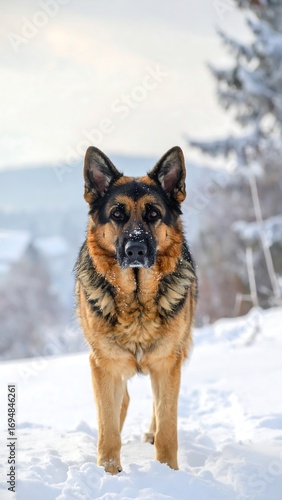 A german shepherd dog stands proudly in a snowy landscape, showcasing its strong and alert demeanor.