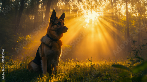 A German Shepherd executing the stay command, vibrant sunrays piercing through the mist