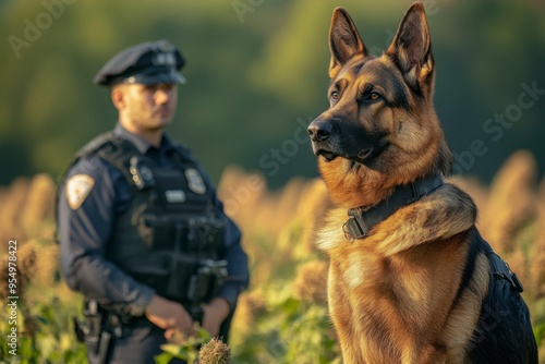 A German Shepherd K9 Officer Stands Guard With Its Handler