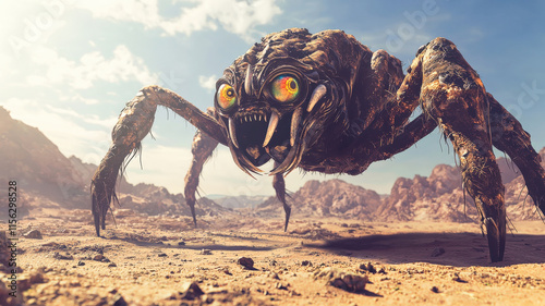 A giant, insectoid monster with multi-colored eyes, crawling across a vast desert landscape, its massive body casting long shadows on the sand.