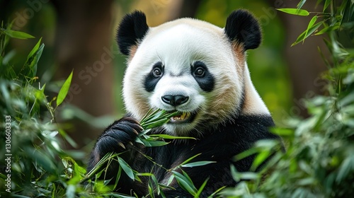 A Giant Panda Is Eating Green Bamboo Leaves Peacefully
