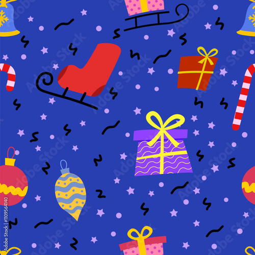 A gift with a bow. balls, skates, felt boots. blue, red gift card background.