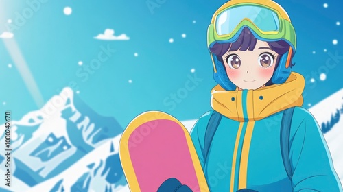 A girl in a blue jacket is holding a snowboard. The image is of a cartoonish girl with a smile on her face