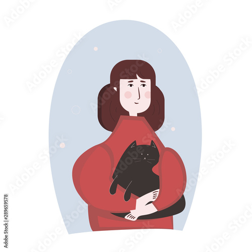 A girl in a sweater holding and hugging her favorite pet - a black cat