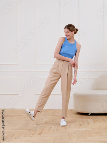 A girl in stylish clothes poses in a studio.