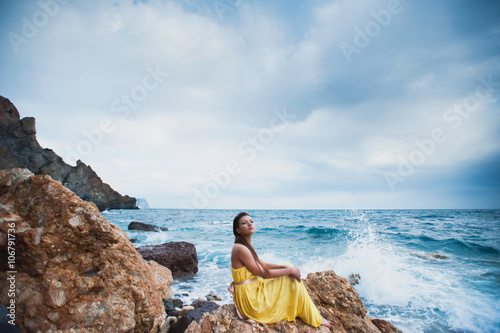 A girl sits on a rock on the beach against the sky and the sea, lifestyle, recreation, solitude, meditation