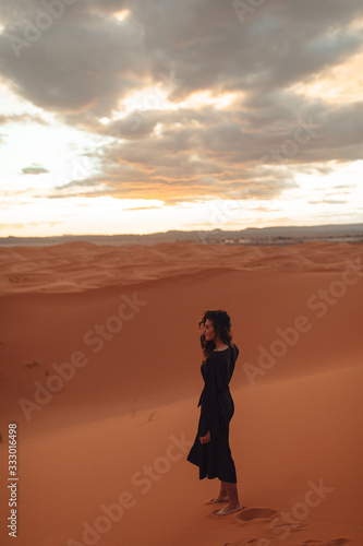 A girl wearing a dark purple dress posing in the desert of Sahara