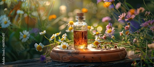 A glass bottle on a wooden board with everlasting flowers and essential oil, creating a natural setting for a copy space image.