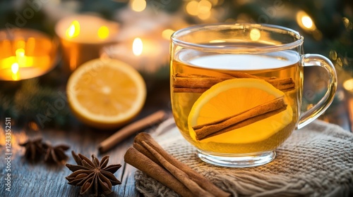 A glass cup filled with aromatic tea, garnished with slices of lemon and sprinkled with cinnamon for added flavor and warmth.