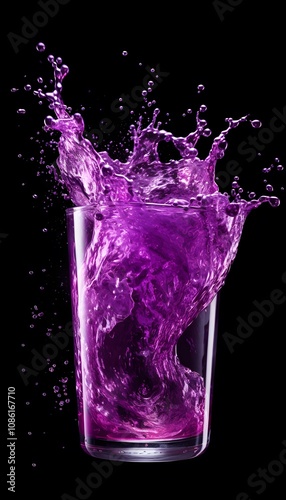 A glass filled with purple liquid, splashing and creating dynamic water droplets.